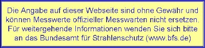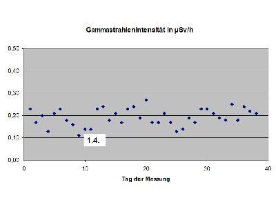 Welche Werte sind "normal"? Das Bundesamt für Strahlenschutz misst großflächig in Deutschland etwa 0,08 bis 0,17 µSv/h. Die Strahlungswerte ergeben sich aus der Addition der kosmischen Strahlung und der vom Erdkörper und Atmosphäre ausgesandten Strahlung. Letztere setzt sich aus natürlicher und künstlicher Radioaktivität zusammen. Der Anteil an künstlicher Radioaktivität (zum Beispiel durch freigesetzte radioaktive Isotope aus Kernreaktoren oder aus Kernwaffenversuchen auf der Erdoberfläche) ist innerhalb der oben genannten Werte vernachlässigbar klein. Unsere Messung ergibt tendenziell den doppelten Wert, was aber mit dem Messverfahren zusammenhängen kann.